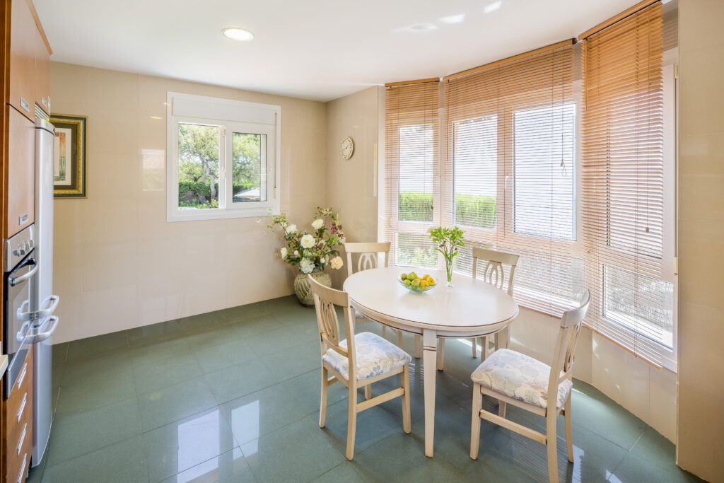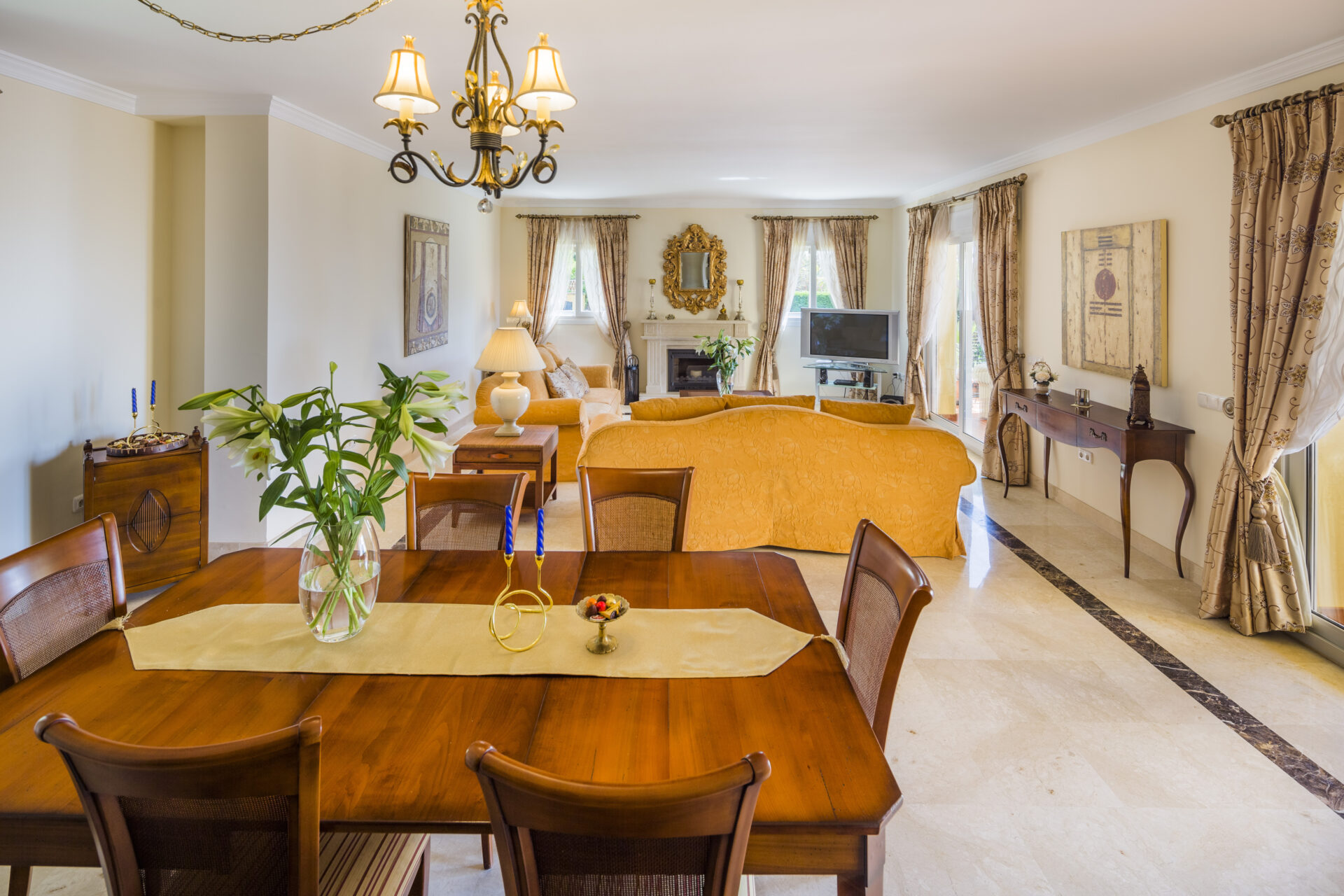 The villa features four spacious bedrooms and five bathrooms, a fully equipped kitchen designed for both family living and entertaining, and elegant marble flooring throughout, with electric underfloor heating in the bathrooms. The living area is complemented by a fireplace, while the home benefits from air conditioning (hot & cold) throughout, fully renovated in 2018.